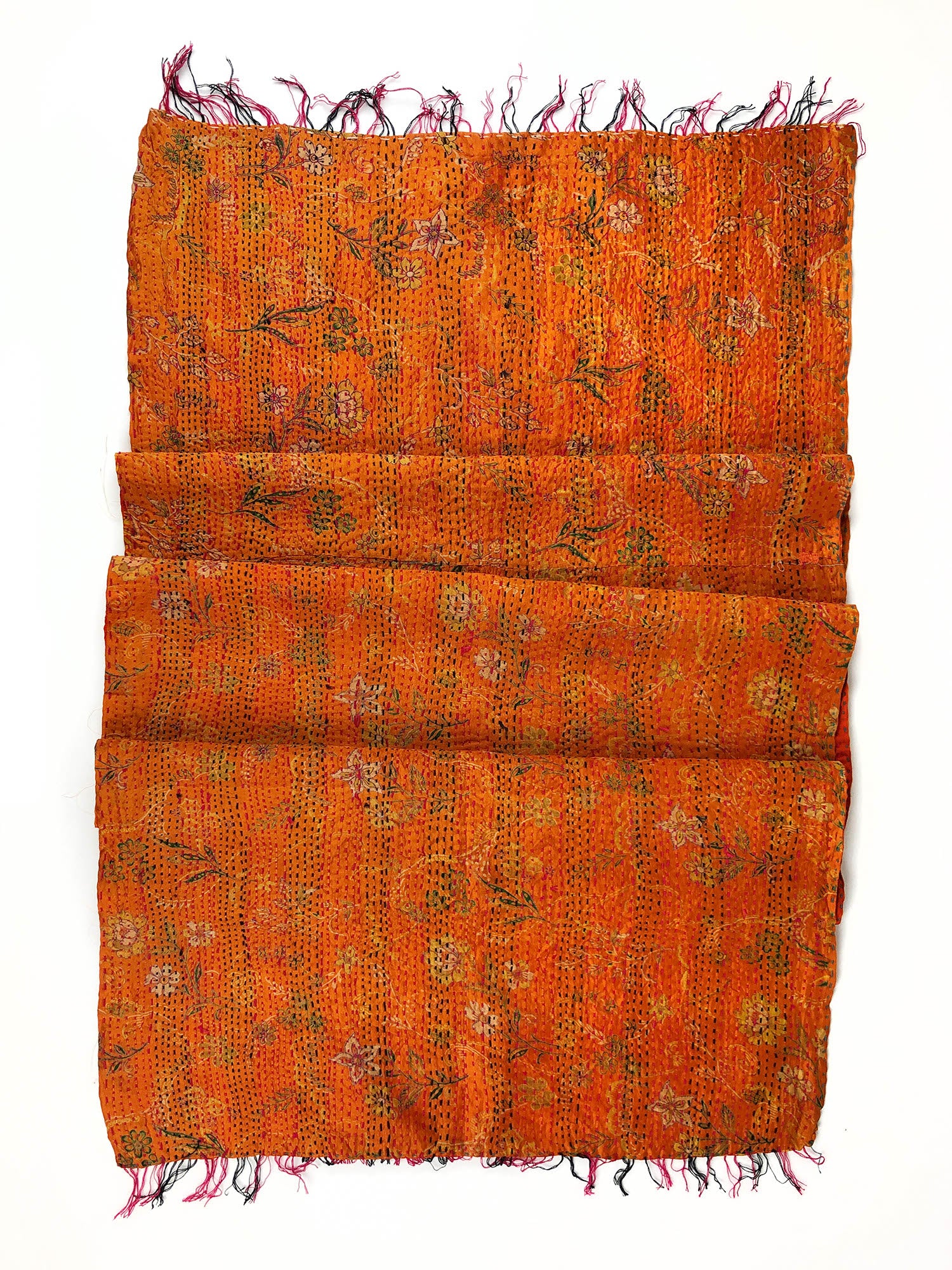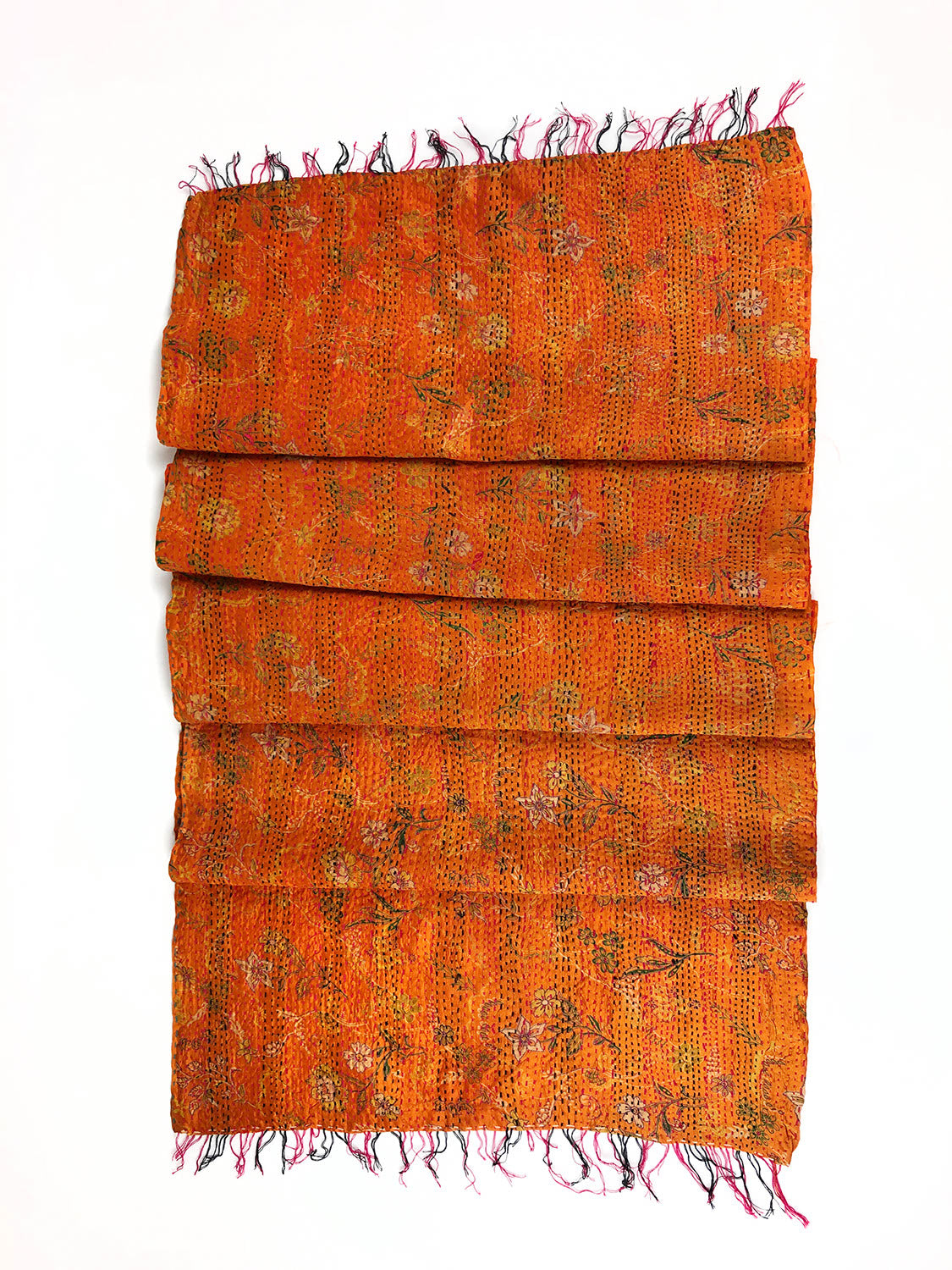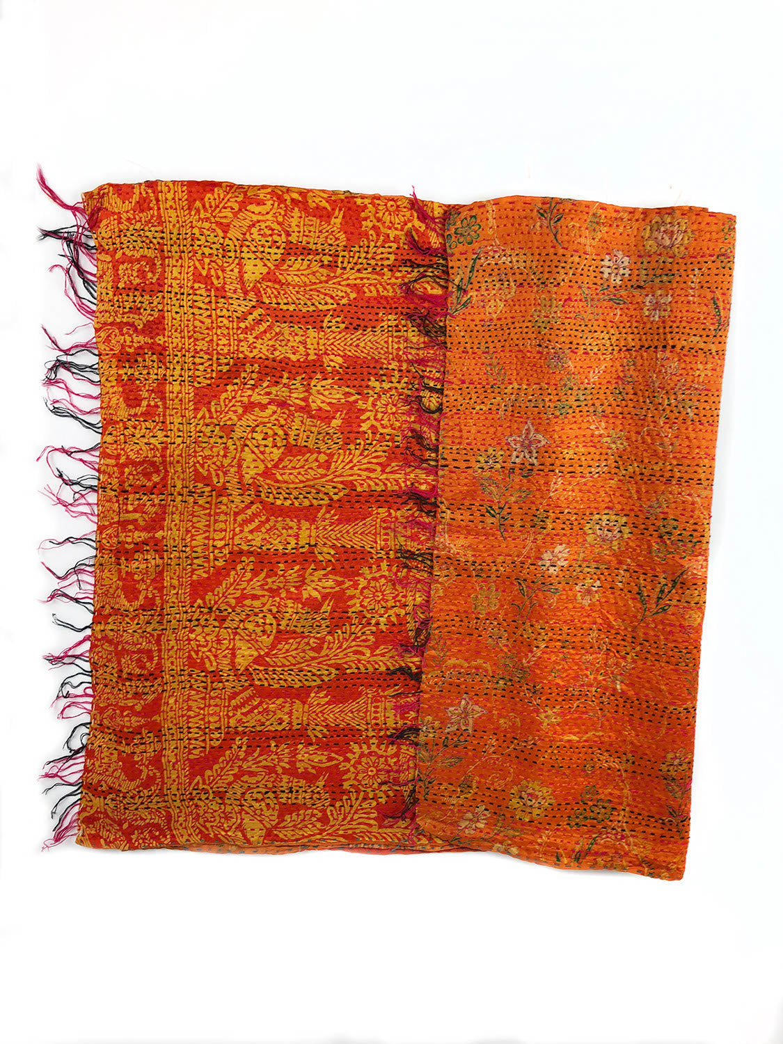 Die traditionellen Saris aus Seide werden mit Kantha-Stickereien vernäht. Jeder Schal ist somit ein Unikat mit unterschiedlichsten Mustern und Farben.