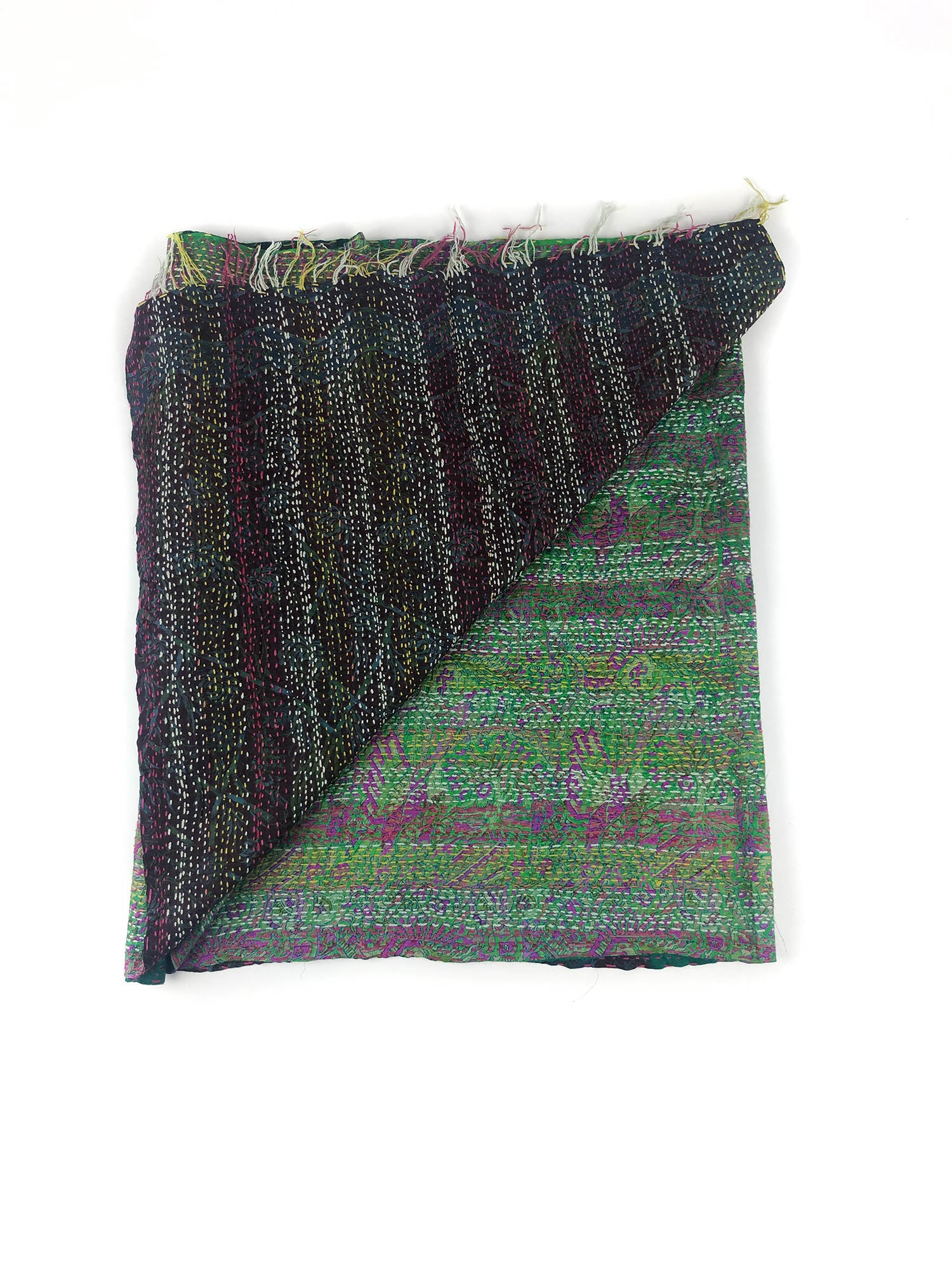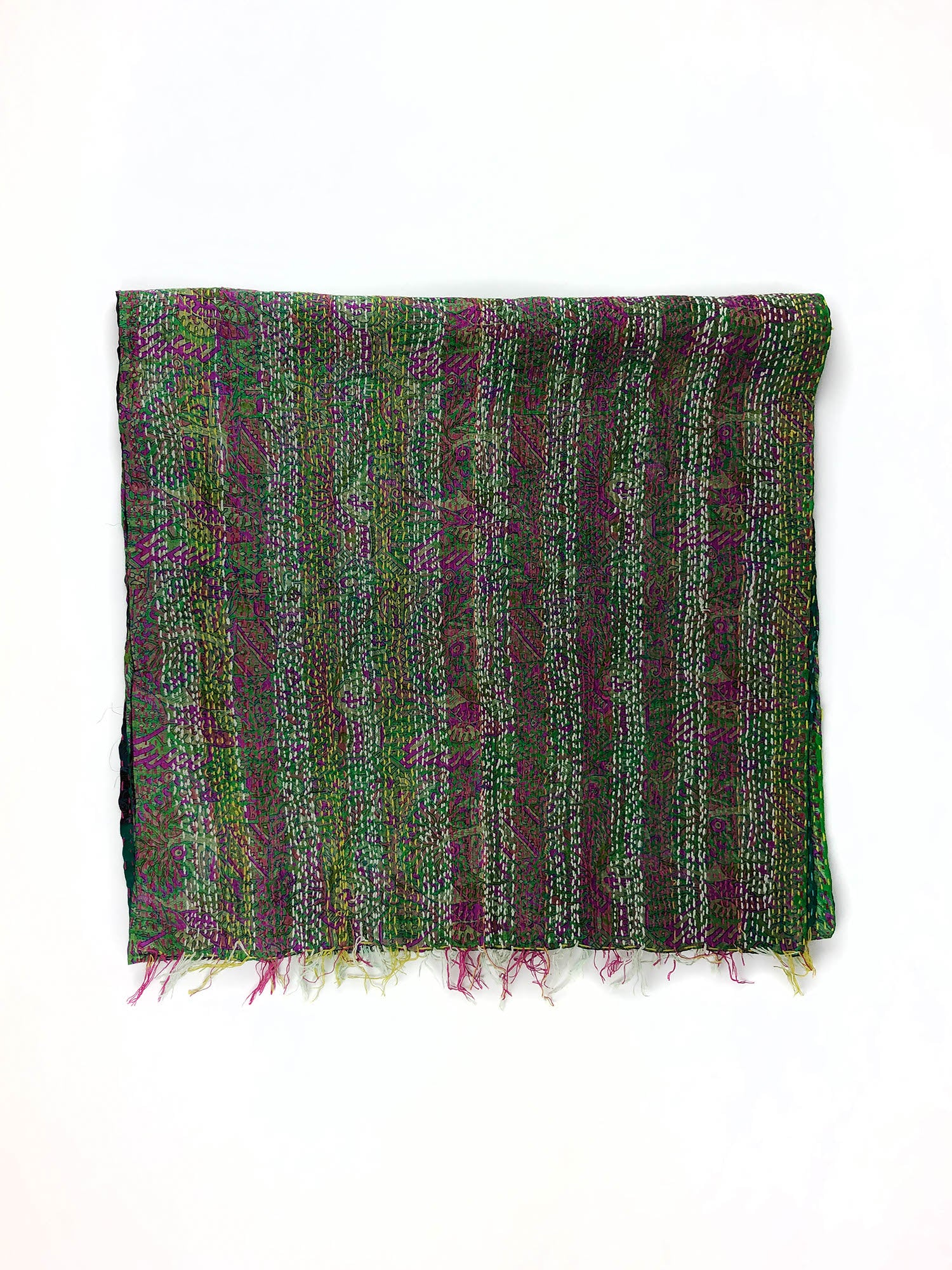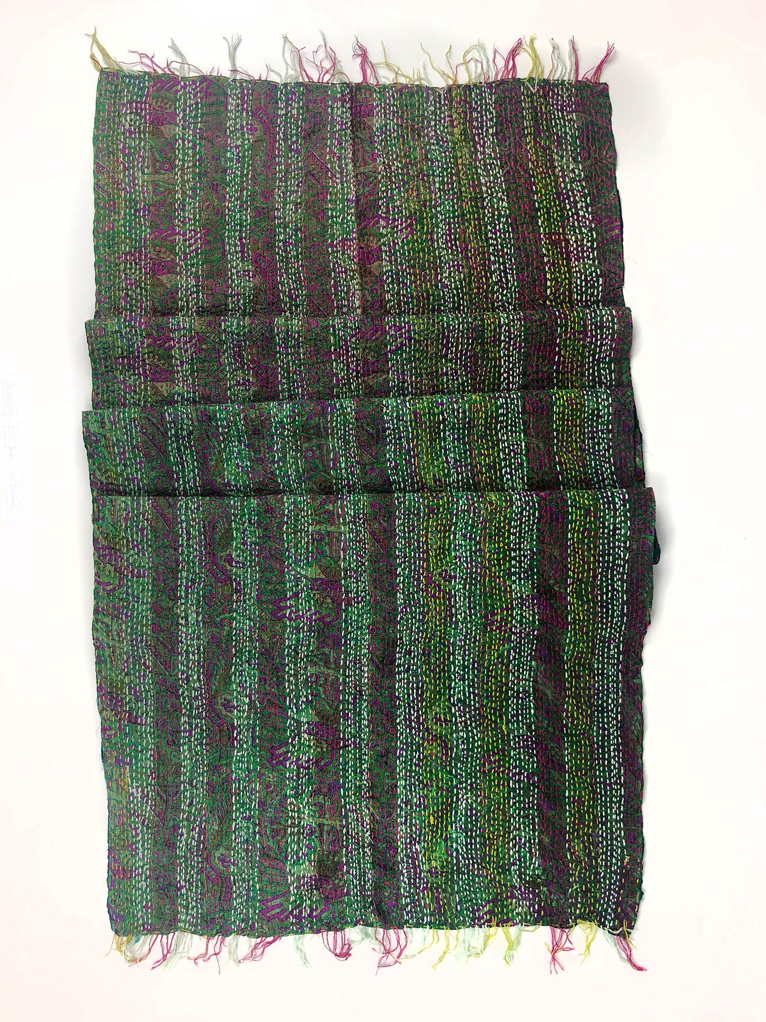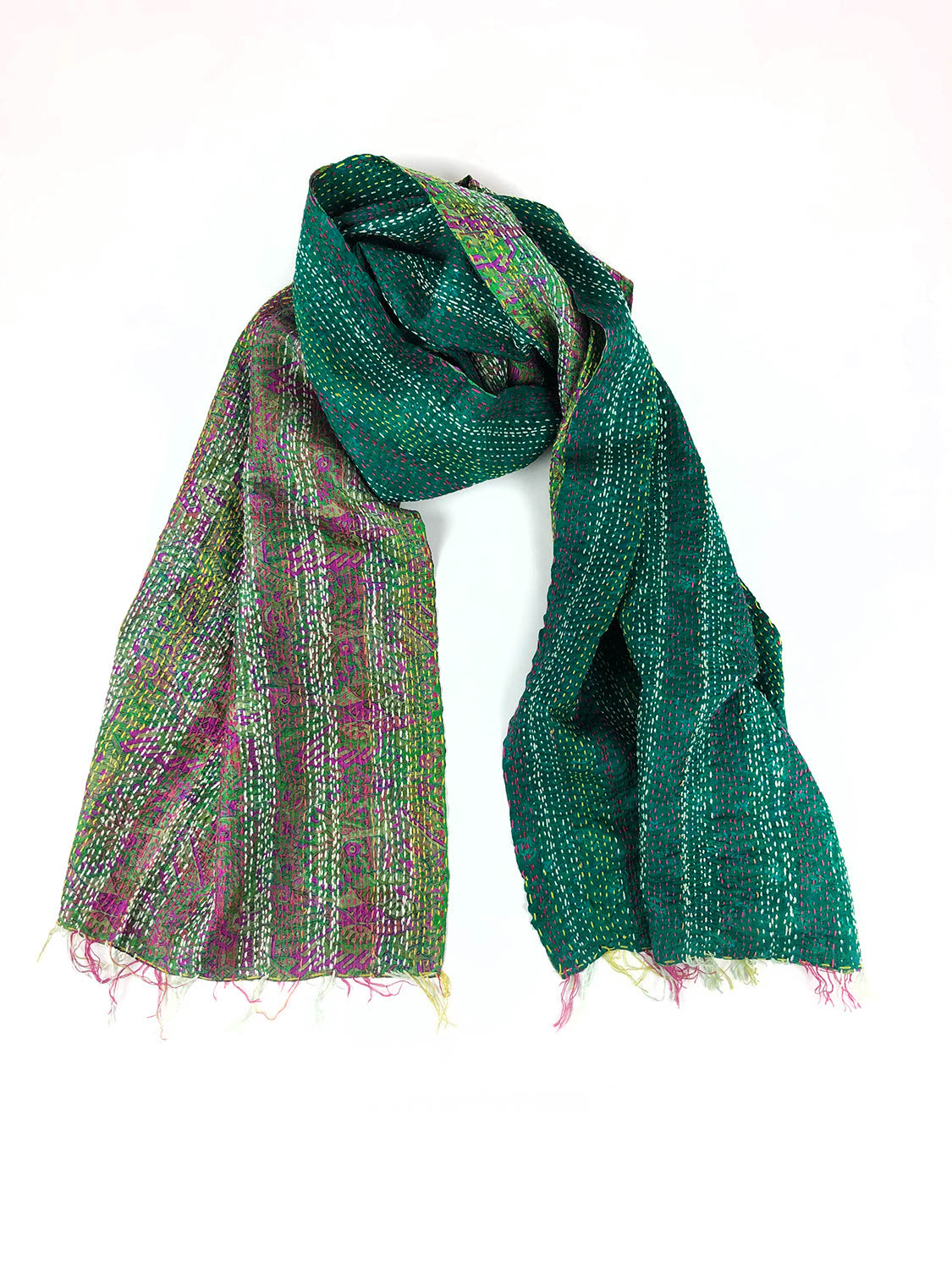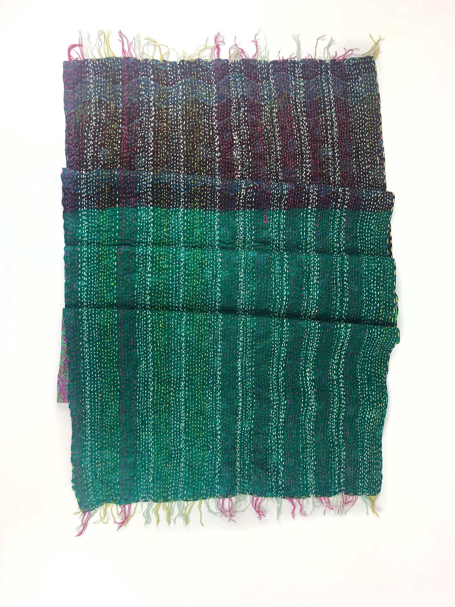 Die traditionellen Saris aus Seide werden mit Kantha-Stickereien vernäht. Jeder Schal ist somit ein Unikat mit unterschiedlichsten Mustern und Farben.
