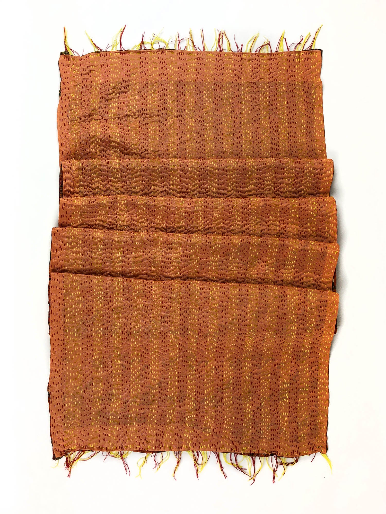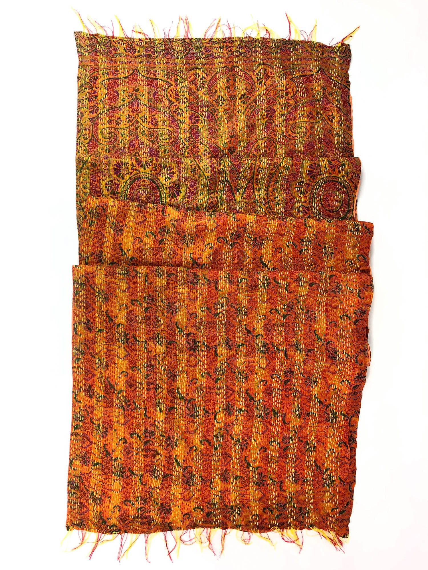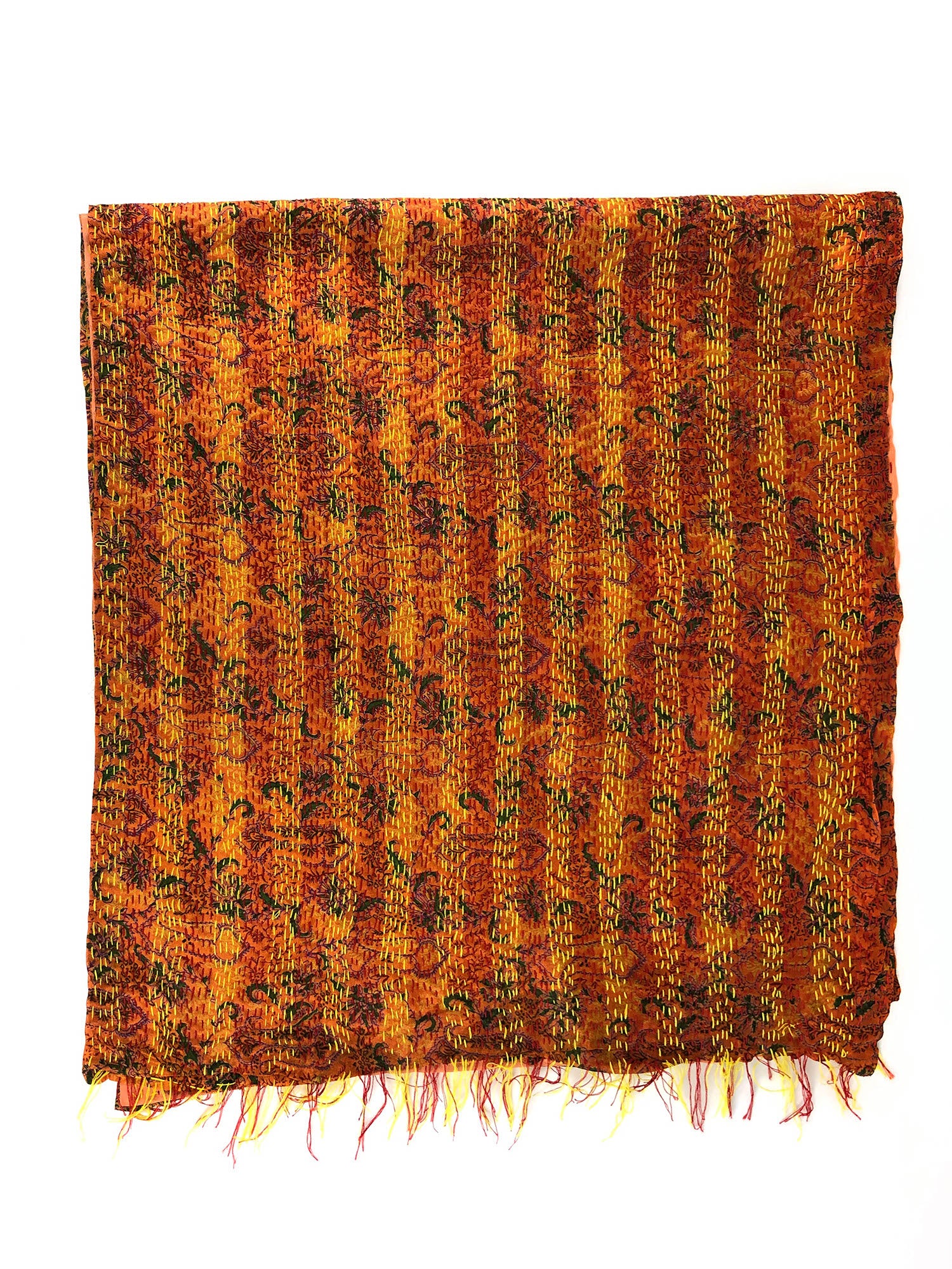 Die traditionellen Saris aus Seide werden mit Kantha-Stickereien vernäht. Jeder Schal ist somit ein Unikat mit unterschiedlichsten Mustern und Farben.